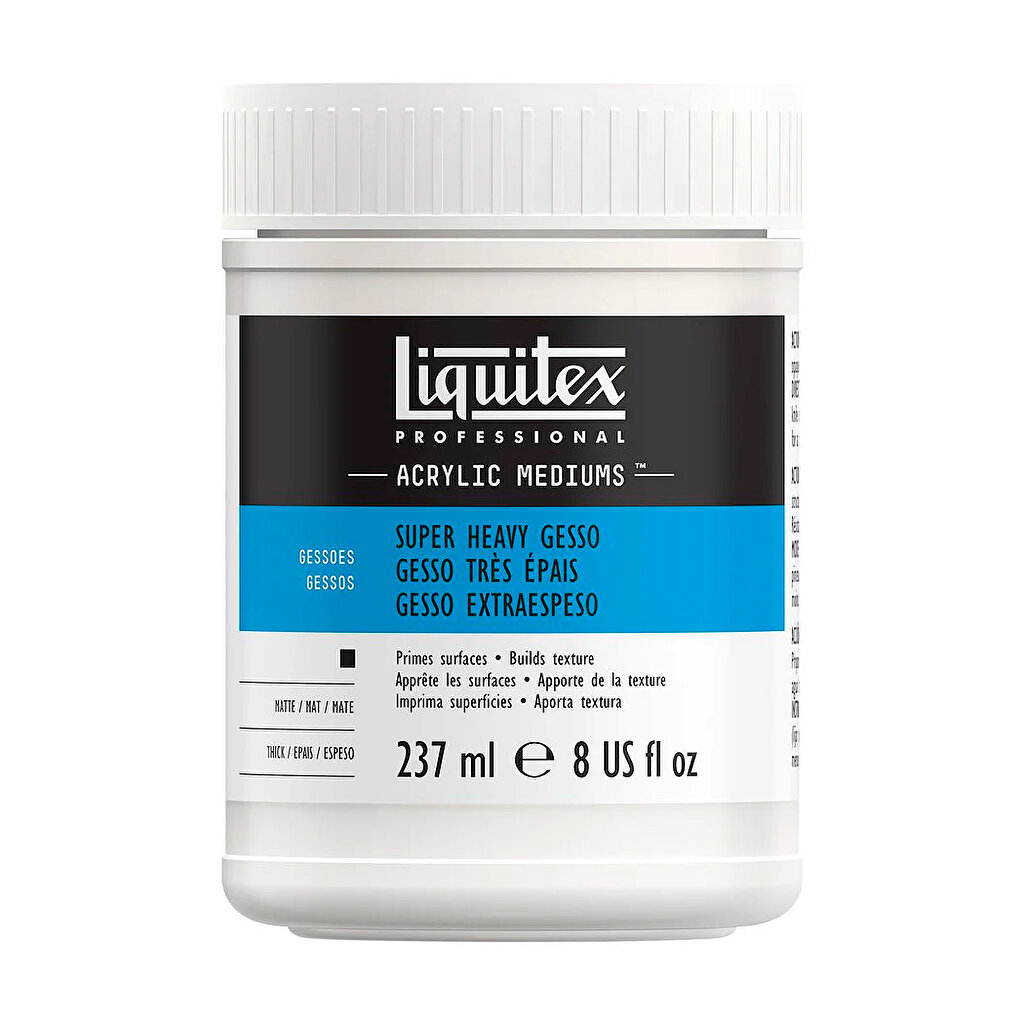 Super Heavy Gesso is a super thick, titanium white gesso that gives free rein to the imagination while priming just as well as a traditional gesso. Thanks to its thickness, it holds its shape and is excellent for sculpting. 237ml.
