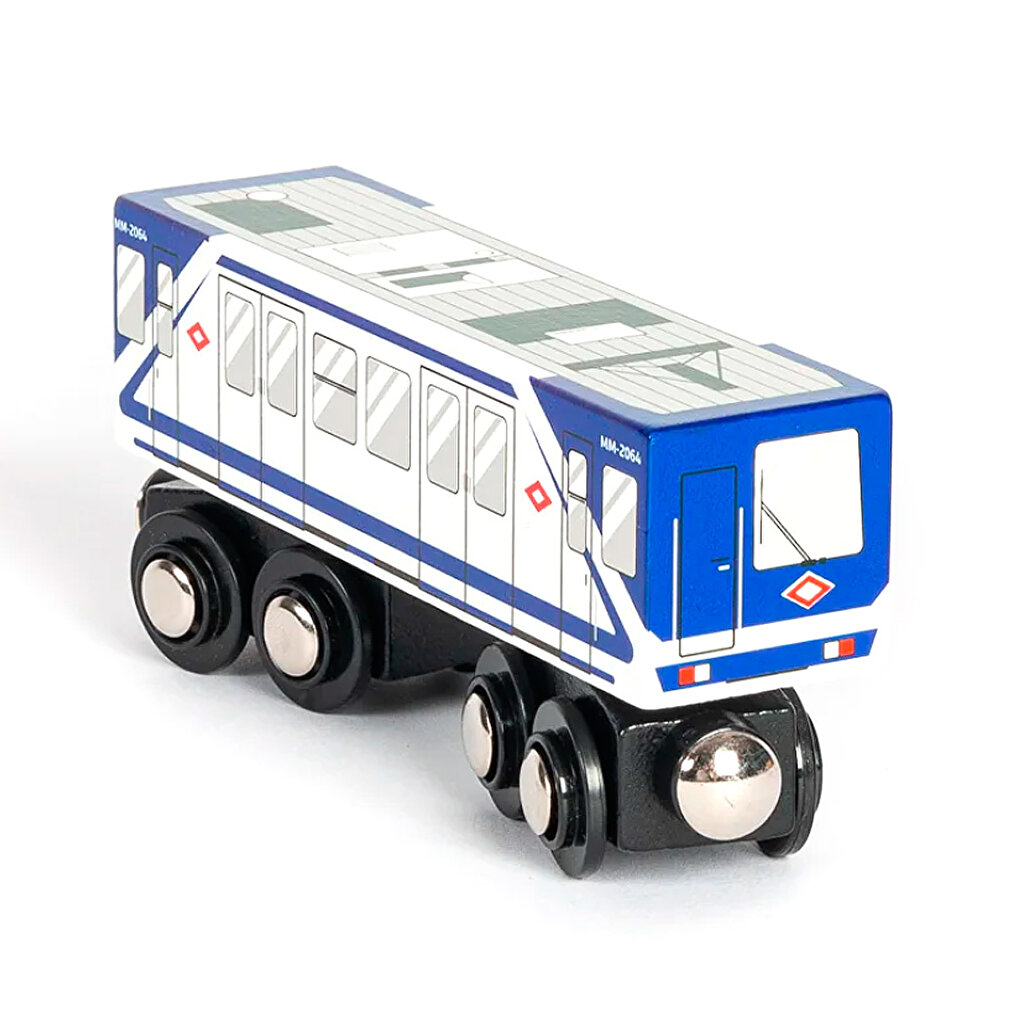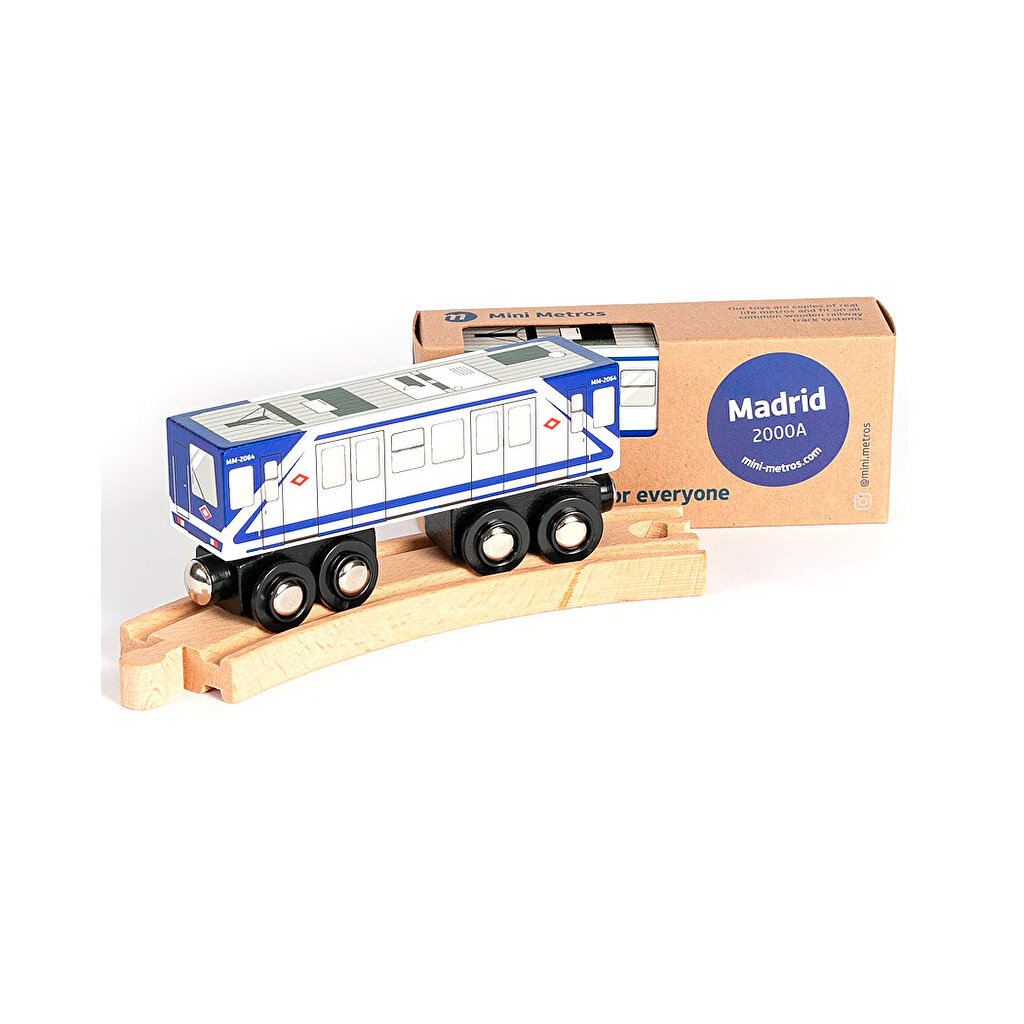 Discover a miniature version of the Madrid Metro, made from sustainable wood. The set includes Mini Metro + 1 custom track piece and is compatible with all common wooden railway systems such as Brio, Ikea, and more. Magnetic connectors allow you to link as many trains as you like. Perfect for children ages 3 and up.