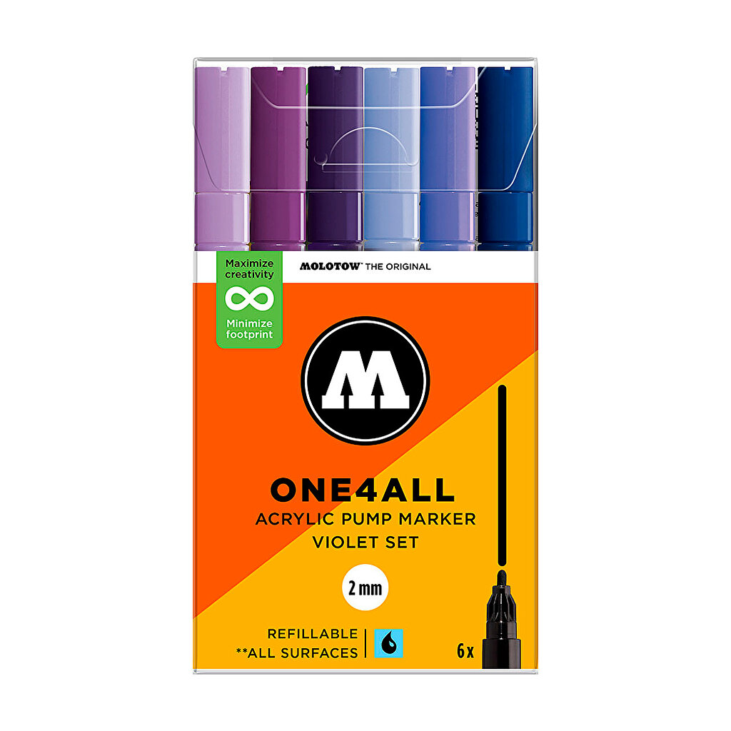 A set of 6 One4All 127HS in violet tones. The pens have a 2mm tip that is easy to replace and the pens can also be refilled with Molotow ONE4ALL Refill. Check the specifications to see which colors the set contains.