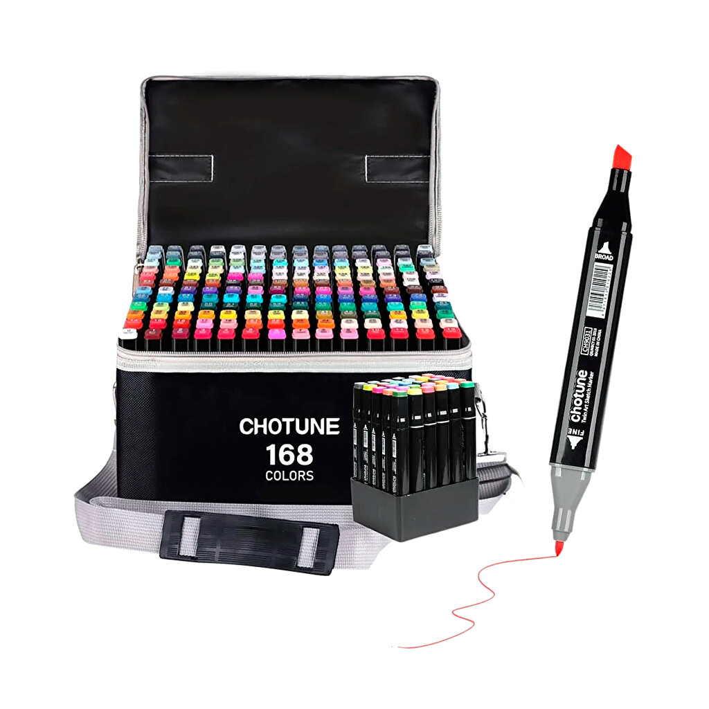 Chotune Alcohol Markers 168-set are alcohol-based artist pens that have dual tips: a chisel tip for broad lines and large areas, and a finer tip for details and contours. The ink is quick-drying, smudge-free, acid-free, non-toxic and safe for children. The pens come in a wide range of colors for all creative needs and are easy to mix and tint to create new shades and effects. The color-coded caps prevent the tips from drying out and make it easy to find the right color. A carrying case and base are included for easy storage and transport.