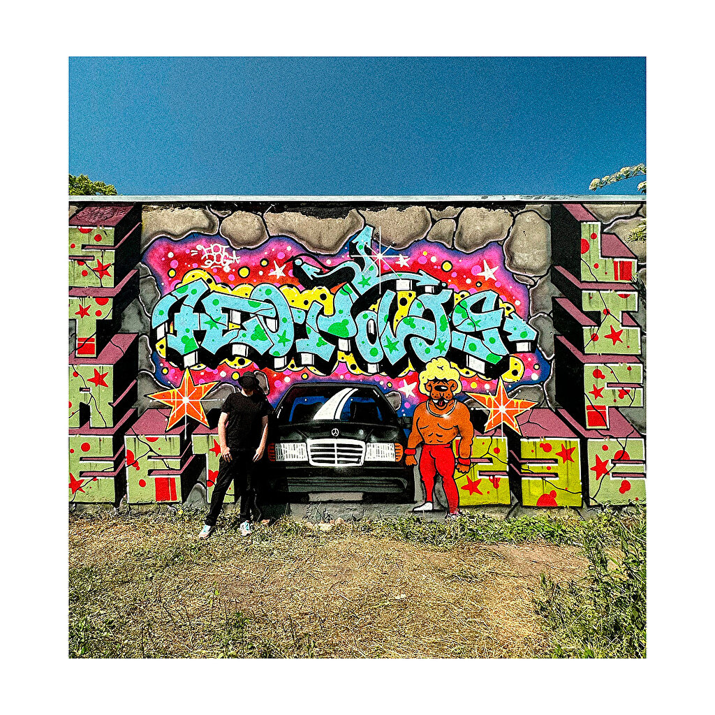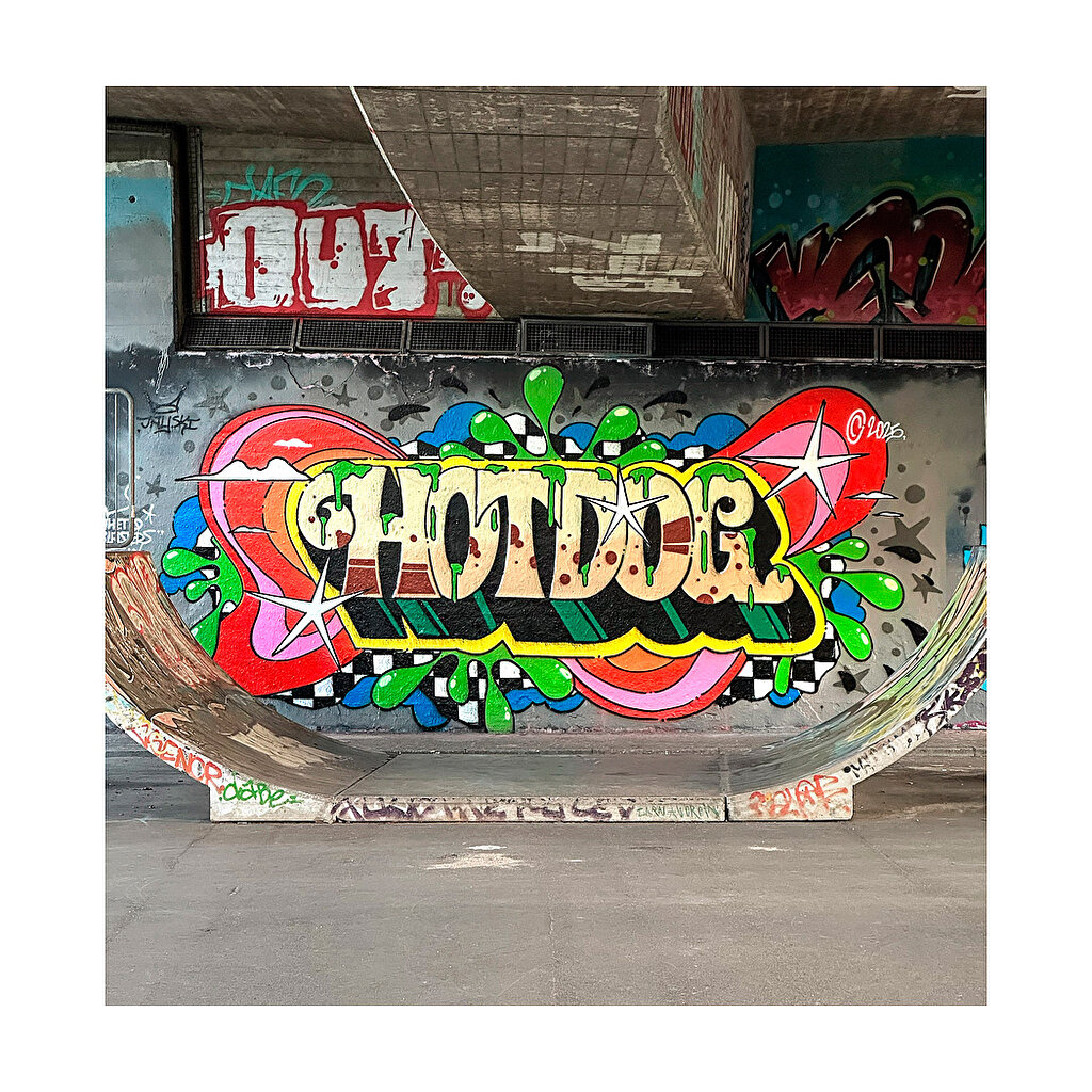 Hotdog, also known as Superspray and the double-hand of doom, is an internationally acclaimed artist. Known for his iconic three-eyed figures and colorful murals. His works are filled with psychedelic elements and playful references, often with a humorous undertone that has made him a well-known name in the global graffiti scene.
