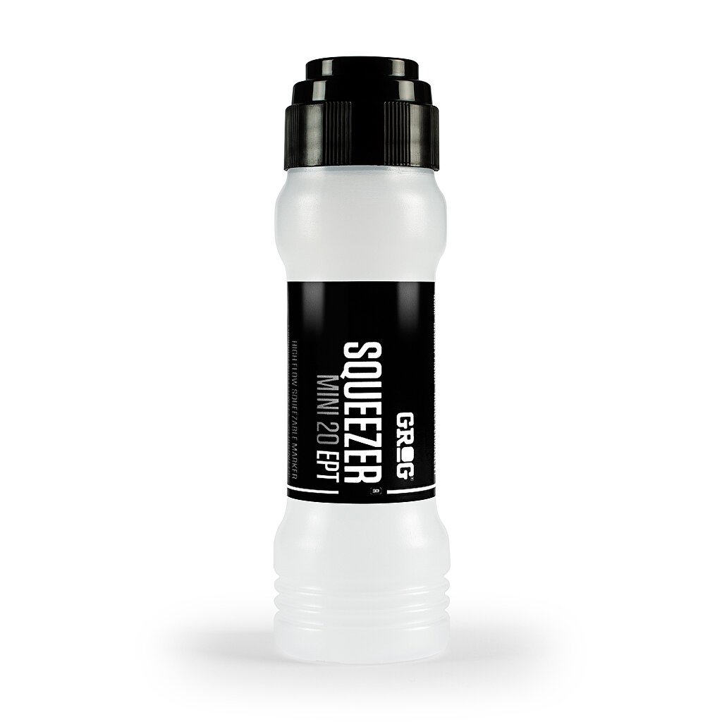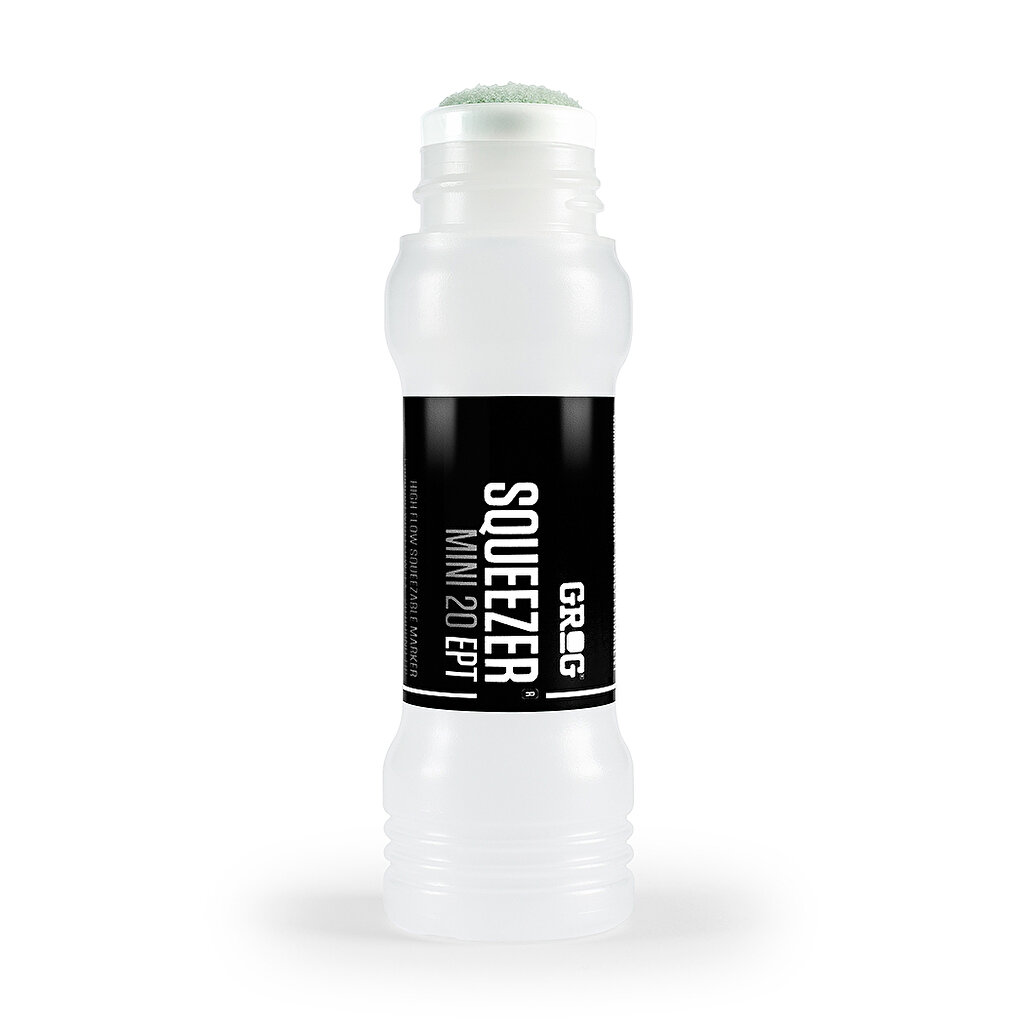 Grog Squeezer Mini 20 EPT, Empty. Som namnet antyder kan du genom att squeeza/klämma på pennan kontrollera mängden färg eller bläck som pumpas ut. Squeezern har en 20 mm rund udd likt en bingopenna, med praktisk skruvkork.